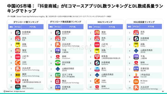 中国のiOS市場において、『抖音商城(Douyin Mall)』は目覚ましい活躍を見せ、ECアプリダウンロードランキングとダウンロード成長量ランキングの両方でトップを獲得しました。豊富なショート動画コンテンツとショッピングシーンの深い融合によって、プラットフォームは大量の新規ユーザーのダウンロードを獲得しただけでなく、アクティブユーザーの継続的な参加も促進しています。効率的なレコメンドアルゴリズムとパーソナライズされたショッピング体験によって、『抖音商城』は競争の激しいEC市場で頭角を現し、ブランドプロモーションとユーザー転換の重要なチャネルとなっています。
