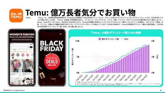 Sensor Towerのデータによると、2023年から2025年にかけて、『Temu』は3年連続で世界のショッピングアプリダウンロード数ランキングでトップを維持し、北アメリカ、中南米、中東、アフリカ、日韓など複数の地域で同カテゴリーアプリランキングトップを獲得し続けています。2025年10月時点で、『Temu』の世界累計ダウンロード数は12億を突破し、2025年8月の世界月間アクティブユーザー規模は5.3億に達し、過去最高を記録しました。