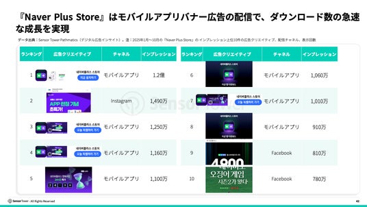 リリース初期に『Naver Plus Store』はモバイルで大規模にバナー広告を展開し、ダウンロード数の急速な成長を牽引することに成功しました。目を引くビジュアルデザインと期間限定のお得情報によっていち早くユーザーの注目を集め、効果的にコンバージョンを促進し、2025年3月から5月にかけて『Naver Plus Store』は『ChatGPT』を超えて韓国市場でダウンロード数最多のモバイルアプリとなりました。