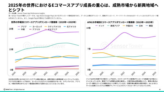 2025年の世界におけるEコマースアプリ成長の重心は、成熟市場から新興地域へとシフトしています。アジアが引き続きトップを走り、ヨーロッパと北アメリカは安定化する一方、ラテンアメリカ、アフリカ、中東が世界のダウンロード数成長を牽引する新たなエンジンとなっています。