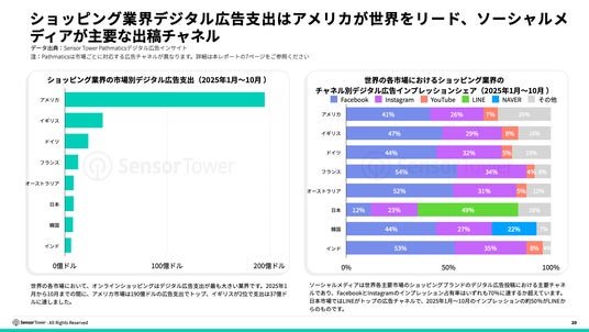 世界的に見て、オンラインショッピングはデジタル広告支出が最も多い業界となっています。2025年1月から10月にかけて、アメリカ市場は190億ドルの広告支出でトップの座を占め、イギリスが37億ドルで続きます。