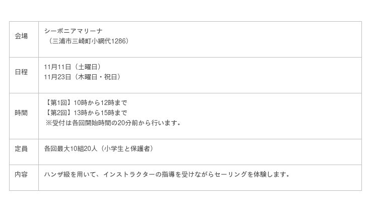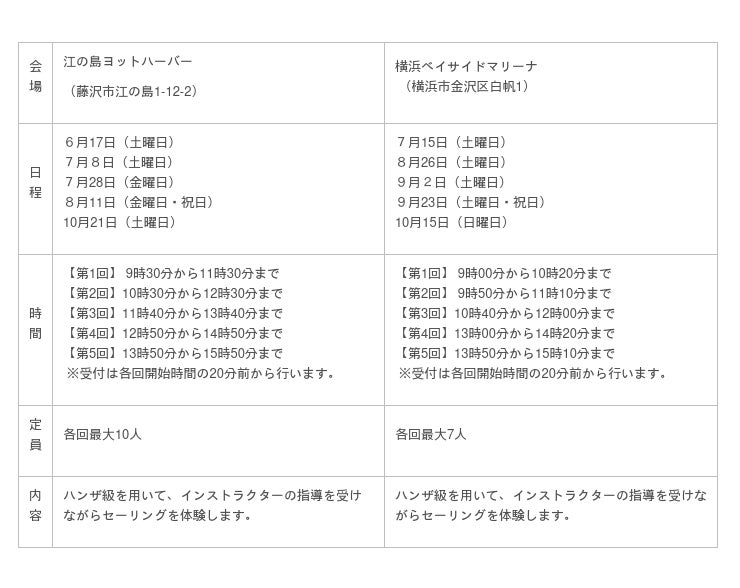 会場は県内3か所(江の島ヨットハーバー、横浜ベイサイドマリーナ及びシーボニアマリーナ)で、実施期間は6月から11月までです。