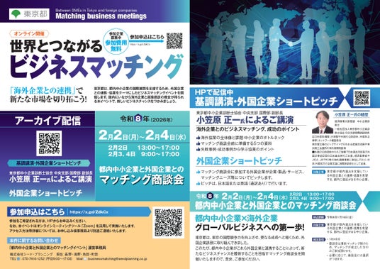 株式会社シード・プランニング(本社:東京都文京区、代表取締役社長:梅田 佳夫)が「都内中小企業者と外国企業との連携促進事業」の支援事業者として運営事務局を務める「都内中小企業と外国企業とのマッチング商談会」(主催:東京都)が2026年2月2日(月)~4日(水)にオンラインにて開催されます。