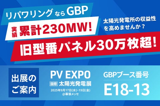 再生可能エネルギー、EV自動車部品、AI及びIoT領域における先進技術を駆使し、グローバルに急速に成長している、~再エネ業界の風雲児~ GBP株式会社(本社:東京、以下GBP)は、2025年9月17日(水)から19日(金)で幕張メッセで開催されるPV EXPO【秋】~第21回 [国際] 太陽光発電展に出展します!近年、需要が増加しているリパワリングをテーマに太陽光発電の部材メーカーだからこそ実現できる一社完結のワンストップソリューションをご紹介します!リパワリング設計、部材提供、工事、O&M、リサイクルまでを自社で行えるため、発電所の収益を最大化に貢献することができます。