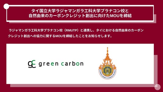 Green Carbon株式会社(代表取締役:大北潤、以下Green Carbon(読み:グリーンカーボン))はこの度、ラジャマンガラ工科大学プラナコン校(以下RMUTP)と連携し、タイにおける自然由来のカーボンクレジット創出への協力に関するMOUを締結したことをお知らせします。