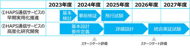 本研究開発では、2025年度までに早期実用化に向けた国内成層圏環境でのHAPS通信サービス実験を行い、2027年度までにHAPSのサービスリンク及びフィーダリンクにおける研究開発成果の統合実証試験を行う予定です。