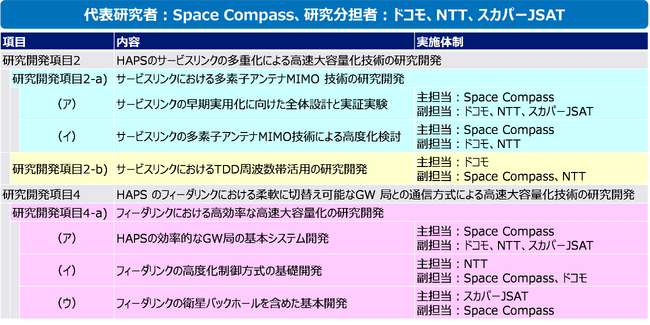 本研究開発は、NICTによる「革新的情報通信技術(Beyond 5G(6G))基金事業」における令和5年度新規委託研究の公募「Beyond 5Gにおける超広域・大容量モバイルネットワークを実現するHAPS通信技術の研究開発(課題番号077)」のうち、研究開発項目2「HAPSのサービスリンクの多重化による高速大容量化技術の研究開発」及び、研究開発項目4「HAPSのフィーダリンクにおける柔軟に切替え可能なGW局との通信方式による高速大容量化技術の研究開発」に採択されたものです。代表研究者はSpace Compassが担当し、ドコモ、NTT、スカパーJSATは共同研究者として参画します。具体的には、各研究開発項目に対して以下の実施体制で取り組みます。