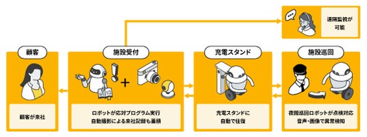 受付業務での顧客の来社検知から受付対応、ロボットの充電スタンドへの出入り、さらに夜間は巡回ロボットとして異常を検知するなど、用途に応じた構築・開発が可能です。