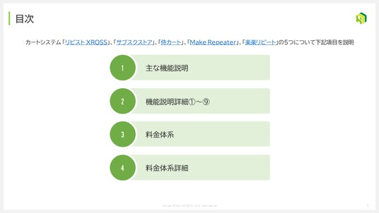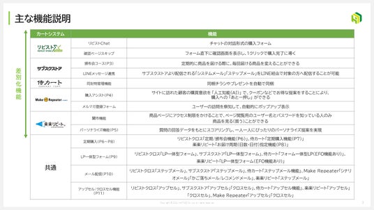 本資料では、5つの定期商材向けカートシステムについて比較し、それぞれの特徴や商材による向き不向き等をご紹介しています。