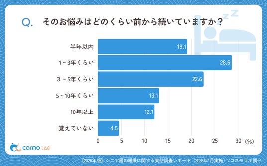 一方で、「5~10年くらい」(13.1%)や「10年以上」(12.1%)など、睡眠に対する悩みが長期化しているケースもありました。
