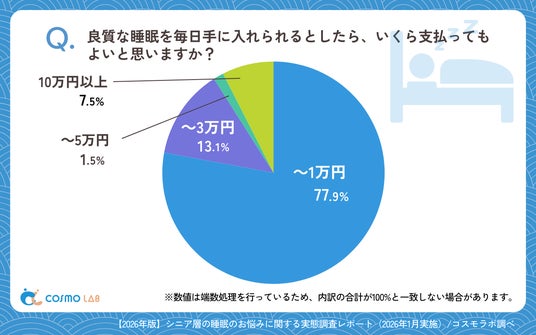 良質な睡眠を毎日得られる場合に、そのサービスや商品に対していくら支払えるかでは、「~10,000円」(77.9%)が大半を占めました。