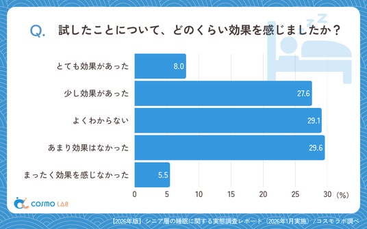 試した対策の結果については、「あまり効果はなかった」(29.6%)と「よくわからない」(29.1%)がほぼ同程度となりました。さらに「少し効果があった」(27.6%)が続きました。