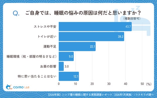 睡眠の悩みの原因として、「ストレスや不安」(43.7%)と「トイレが近い」(39.2%)が上位となり、心理面や生活習慣に関わる要因が中心であることが分かります。「運動不足」(22.1%)も一定割合で挙げられており、日中の活動量や生活リズムが睡眠に影響している可能性も考えられます。