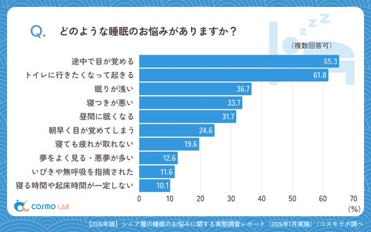 睡眠の悩みでは、「途中で目が覚める」(65.3%)と「トイレに行きたくなって起きる」(61.8%)が多く挙がりました。