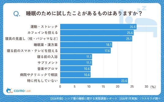 睡眠の改善に向けて試したことでは、「運動・ストレッチ」(26.6%)、「カフェインを控える」(25.6%)、「寝具の見直し(枕・マットレス・布団・パジャマなど)」(25.1%)がほぼ同程度で並びました。