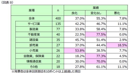 その一方で、「卸売業」では、良化した企業もあるものの、悪化の回答が全体回答割合の2倍以上にのぼっています。このことから、一部の企業にはデメリットが生じていることが浮き彫りとなりました。(図表B)