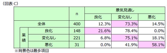 自社業績への影響毎に集計したところ、業績が「良化」した企業では、約2割が景気見通しも「良化」(21.6%)と回答しており、景気見通しが明るい傾向がみられます。他方、業績が「悪化」した企業では、過半数(58.1%)が景気見通しも「悪化」と回答しており、万博開催で業績改善が得られなかったことで、将来への不安が強く表れる結果となりました。(図表C)