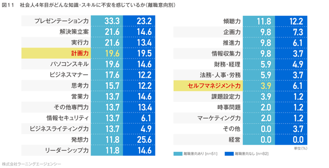社会人4年目の離職意向ありでは、「自由度が高い」環境や、「やりたい業務」を希望する傾向にあることがわかりました。しかし、年次が上がるにつれ業務量が増える中、ある程度自分で業務をコントロールする力を身に付けないと、自由度は高まりません。そのためには計画力やセルフマネジメント力が必要ですが、それらのスキルに対する意識は低めである結果がでたことより、会社側としてはそのようなセルフマネジメント力を身に付けるための機会を提供すること、すなわち企業は自立自走できるためのサポートをすることが重要となるでしょう。