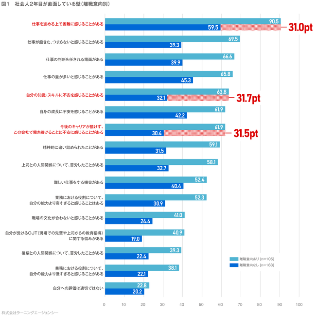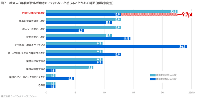 *本調査を引用される際は【ラーニングエージェンシー「若手社員の意識調査(社会人2年目~4年目の直面する壁 特別編 離職意向別)」】と明記ください