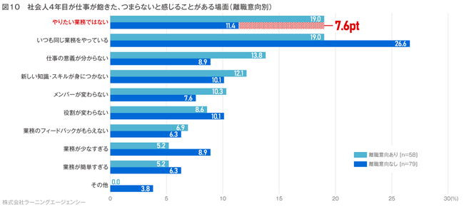 「仕事が飽きた・つまらないと感じる」具体的な場面として、「やりたい業務ではない」「いつも同じ業務をやっている」ときが同率19.0%でトップに。「やりたい業務ではない」においては、離職意向なしと7.6ポイントの差となりました。その後、「仕事の意義がわからない」が13.8%と続きました。(図10)