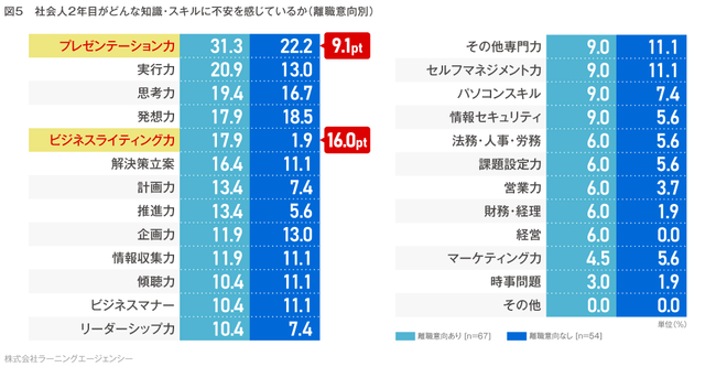 上記設問において、離職意向ありが最も高い割合で困難に感じていた「自分のスキル不足」ですが、2年目社員はどのような知識・スキルに不安を感じているでしょうか。自分の知識・スキルに不安を感じている人に、具体的にどのようなスキルが不安か質問したところ、離職意向ありでは、「プレゼンテーション力(31.3%)」がトップで、離職意向なしよりも9.1ポイント高い結果でした。また、離職意向ありとなしの差で最も大きかった項目は「ビジネスライティング力」で16.0ポイント意向ありが高い結果に。プレゼンテーション力やビジネスライティング力は、会議や商談時、また議事録・企画書の作成など、実務において必須のスキルであり、実際に仕事を進めていく中でスキル不足を感じていることが推察できます。(図5)