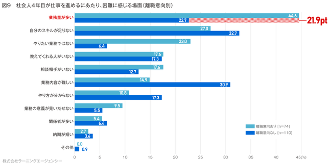 「仕事を進めるにあたり困難に感じたことがある」場面としては、離職意向のある人の44.6%が「業務量が多い」ときと回答しており、離職意向なしと21.9ポイントと大差がありました。(図9)