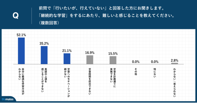 前問で「行いたいが、行えていない」と回答した方に、「Q.「継続的な学習」をするにあたり、難しいと感じることを教えてください。(複数回答)」(n=71)と質問したところ、「自分に最適な学習方法がわからない」が52.1%、「英語の上達を感じることができない」が35.2%、「学習へのモチベーションが続かない」が21.1%という回答となりました。
