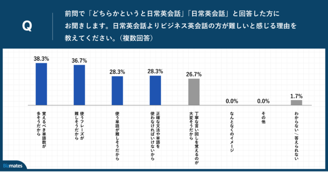 「Q.前問で「どちらかというと日常英会話」「日常英会話」と回答した方にお聞きします。日常英会話よりビジネス英会話の方が難しいと感じる理由を教えてください。(複数回答)」(n=60)と質問したところ、「覚えるべき単語数が多そうだから」が38.3%、「使うフレーズが難しそうだから」が36.7%、「使う単語が難しそうだから」が28.3%という回答となりました。