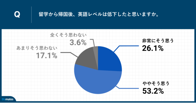 「Q.留学から帰国後、英語レベルは低下したと思いますか。」(n=111)と質問したところ、「非常にそう思う」が26.1%、「ややそう思う」が53.2%という回答となりました。