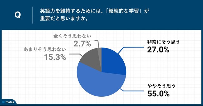 「Q.英語力を維持するためには、「継続的な学習」が重要だと思いますか。」(n=111)と質問したところ、「非常にそう思う」が27.0%、「ややそう思う」が55.0%という回答となりました。