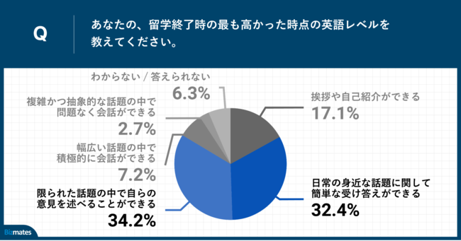 「Q.あなたの、留学終了時の最も高かった時点の英語レベルを教えてください。」(n=111)と質問したところ、「限られた話題の中で自らの意見を述べることができる」が34.2%、「日常の身近な話題に関して簡単な受け答えができる」が32.4%という回答となりました。