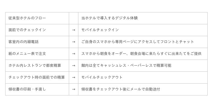 弊社では新型コロナウイルスの世界的な流行以前よりデジタルトランスフォーメーション(DX)化を推進してきました。新型コロナウイルスの影響も受け、今後も「タッチレスな滞在」を推し進め、従来型ホテルにおける不要な接触ポイントを減らすことで、「安心した滞在」をご提供するとともに、デジタル体験そのものをお楽しみ頂けるような演出にこだわり、ワクワクした「新しい宿泊体験」を創出することを目指します。