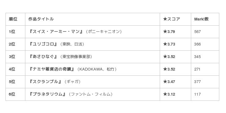 ※Mark!数とは、ユーザーに観た映画として記録された(記録は1作品につき1人1件まで)数を集計した数です。