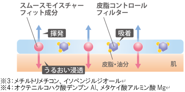肌内部にうるおいを浸透させつつ、表面は素早くなじん でさらりと仕上げるスムースモイスチャーフィット成分※3 と余分な皮脂やべたつく油分をしっかり吸着する皮脂 コントロールフィルター※4 を備えた「うるサラ処方」を採 用。うるおいを抱えながらも、皮脂によるヨレや崩れを 防いで、マスクにも付きにくくします。