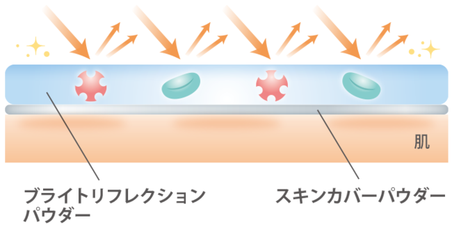スキンカバーパウダー配合により※1、気になる肌の色ム ラやくすみをしっかりカバー。その上を覆うブライトリフレ クションパウダー※2 が、自然光を乱反射させることで、 ワントーン明るい肌へと仕上げます。