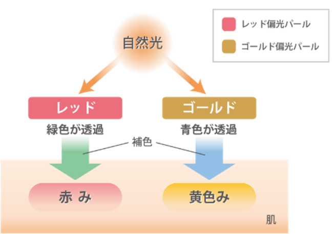 「ゴールド」と「レッド」の 2 色の偏光パールを配合。 レッドパールは、自然光を浴びると赤色の光を反射さ せ、緑色の光を肌に透過。肌の赤みを打ち消して透明 感のある肌へ仕上げます。 ゴールドパールは、自然光を浴びると黄色の光を反射 させ、青色の光を肌に投下し、黄ぐすみ、茶ぐすみを カバーします。