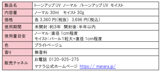 マナラ 〈トーンアップ UV〉は、肌を紫外線からしっかりと守りたいと感じている方や、マスク生活が続く中、軽めのベー スメイクを好まれる方、マスクへのファンデーションの色移りや気になる方などに使っていただきたい、新・日やけ止め ミルクです。最先端の光カット機能を搭載し、紫外線(UVA・UVB)はもちろん、肌の奥深くへ入り込む有害なディープ 太陽光(近赤外線・ブルーライト)もしっかりカットします。また、年齢を重ねることでトーンダウンしがちな大人の肌を ワントーン明るく、ツヤめく白肌へと仕上げます。 普通肌~乾燥肌の方向けのマナラ〈トーンアップ UV ノーマル〉と、超乾燥肌の方向けのマナラ〈トーンアップ UV モイスト〉の2種が登場。トーンアップ UV ノーマルは、特に春夏など肌のベタつきが気になる季節にサラッとした感触 に仕上げたい方に。トーンアップ UV モイストは、特に秋冬の肌の乾燥する季節にしっとりとした感触に仕上げたい方 におすすめです。
