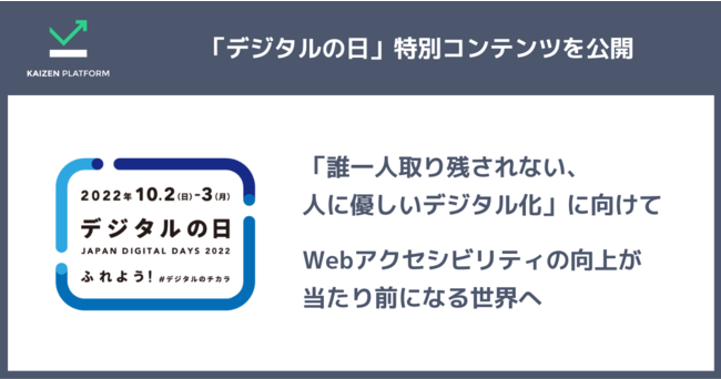 株式会社Kaizen Platform(本社:東京都港区、代表取締役:須藤 憲司、以下「Kaizen Platform」)は、デジタル庁が定める「デジタルの日」に賛同し、ミッションとして掲げられている「誰一人取り残されない、人に優しいデジタル化」の実現に向けたWebアクセシビリティの向上を支援します。
