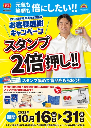 「餃子の王将」を運営する株式会社王将フードサービス(京都市山科区/代表取締役社長 渡邊 直人)は、10月16日(日)から10月31日(月)の期間限定で、現在開催中の『2023年版ぎょうざ倶楽部 お客様感謝キャンペーン』におけるスタンプ押印が2倍となる「スタンプ2倍押し!!」を実施します。