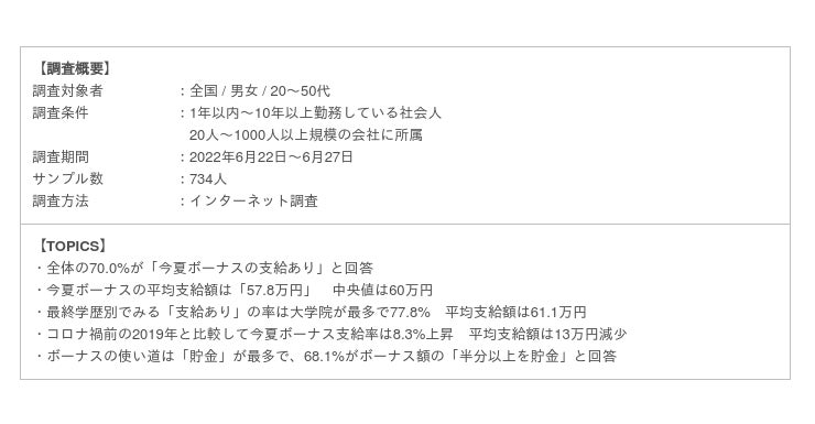 2021年に実施したJob総研調査(※2)では、コロナ禍の影響を受けてボーナスの減額や廃止が7割を超える結果が出ています。それを受けてJob総研では、コロナ禍前の2019年夏ボーナスからの推移を含め、今夏ボーナスの支給有無やその支給額及び、使い道や貯金に回す額などについて調査した「2022年 夏ボーナス実態調査」を実施しました。
