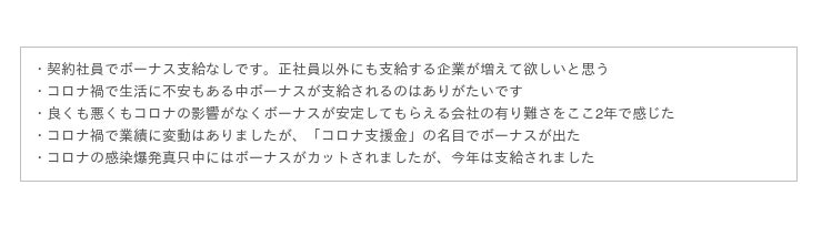 コロナ禍が影響したボーナス支給についての言及が顕著に見られるコメントでした。