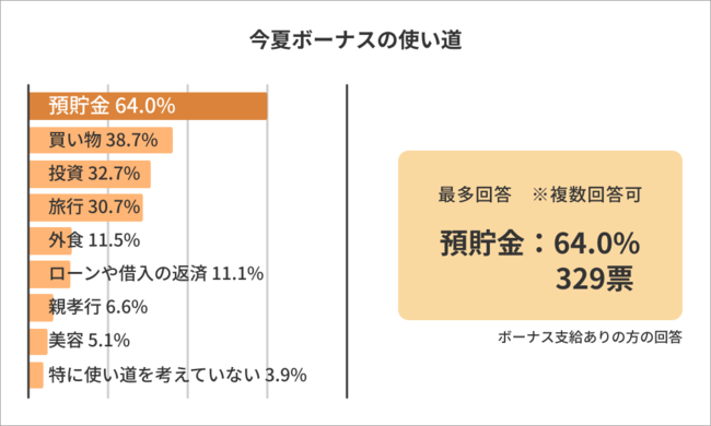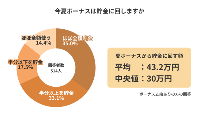 今夏ボーナスの使い道について聞くと「預貯金」が最多回答で64.0%、次いで「買い物」が38.7%、「投資」が32.7%で上位3つの回答になりました。また貯金に回す額について聞くと、「ほぼ全額貯金」が35.0%、「半分以上を貯金」が33.1%で、全体の68.1%が今夏ボーナスを半分以上貯金すると回答しました。貯金に回す具体的な金額についても聞くと、平均43.2万円の結果になりました。