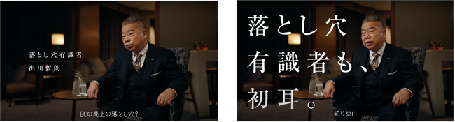 今回制作した新CMは、「落とし穴有識者・出川哲朗さん」にインタビューを実施。インタビューでは、思い出深い落とし穴のエピソードや見事に落とし穴に落ちた瞬間の感情など、有識者ならではの目線でこれまでを振り返っています。しかし、落とし穴については流暢に語っていただくも、ECの落とし穴については「EC」というワード自体が「初耳である」という結果に。ドッキリの落し穴とECの落し穴というテーマの絶妙なミスマッチさにご注目ください。