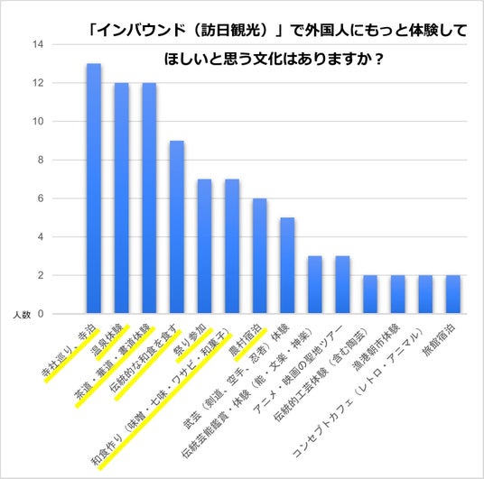 一方、インフルエンサーが選ぶ「もっと体験してほしい文化・場所」では、寺社仏閣巡り・寺泊・禅宗体験、温泉体験、茶道・華道・書道といった伝統文化の体験が1~3位と上位に。複数人のコメントとして注目すべきは単なる観光でなく、<主体的経験>をしたいと希望していることだ。ただ寺社仏閣を訪問するのでなく宿泊したい、座禅をくみたい、伝統文化を鑑賞するだけでなく実際に着物を着て試してみたい、と望んでいる。4位:和食・日本酒体験でもラーメンなどのB級グルメでなく懐石料理や精進料理といった伝統料理を希望しており、6位:料理体験にしても、実際に寿司を握り、味噌・七味・ワサビなどの調味料を作りたいという、<和食の根源的な味>に触れたい欲求を持つ。5位の祭り参加についても、有名な祭りよりも秋田県・竿灯祭りや滋賀県・近江の火祭りなど、地方ならではの趣のある祭りを複数人がピックアップしている。農家に宿泊して田舎暮らしを体験する7位の<農泊>も、例えば石川県能登で始まった取り組みを薦めている。