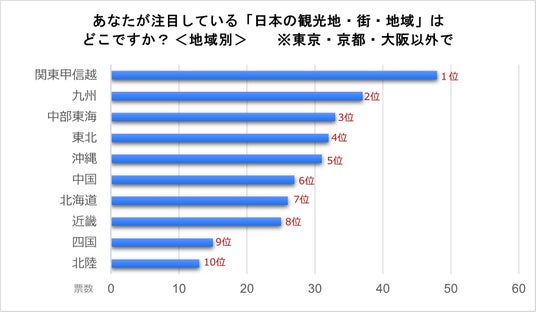 日本通の海外インフルエンサーが注目する3都市以外の地域では、1位に関東甲信越地方がランクイン。箱根と鎌倉を有する神奈川県、ウィンタースポーツのメッカである長野県、多種の温泉を有する群馬県の存在、いずれも東京からのアクセスが良いことが理由として挙げられている。