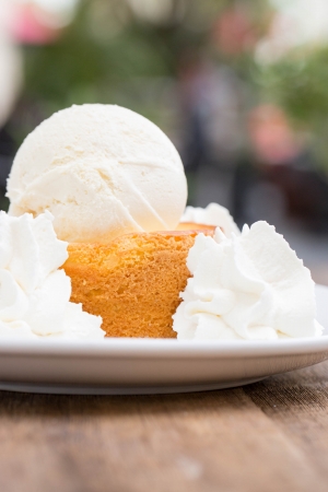しっとり温かいバターケーキに、バニラアイスとホイップクリームをトッピング。