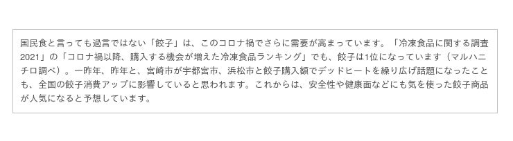 「市販品の餃子喫食ランキング」は、コロナ禍の影響で上位のほとんどを中食が占める結果になりました。ランクインしている飲食店もありますが、全店舗でテイクアウト対応のほか冷凍餃子の販売を行っているため、飲食店でカウントされていても中食の可能性も高いと考えられます。