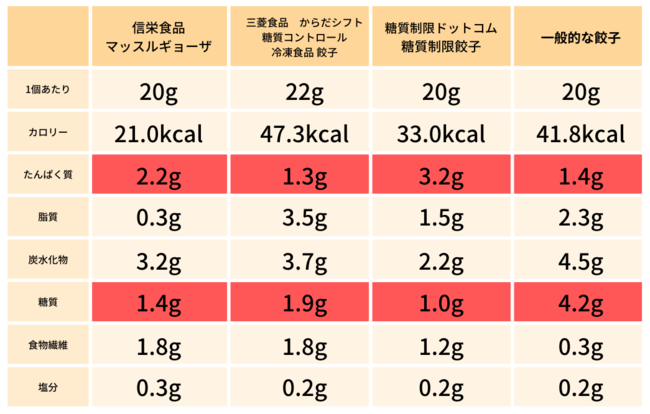 また近年は、3位にランクインしている「信栄食品マッスルギョーザ」のような糖質の制御をした上で、しっかりたんぱく質がとれる餃子の人気が上がってきています。「信栄食品マッスルギョーザ」「三菱食品 からだシフト糖質コントロール 冷凍食品餃子」「糖質制限ドットコム糖質制限餃子」の3商品と、通常の餃子の栄養素を比較した右の表を見ると、糖質が1/2~1/4まで抑えられていることが分かります。他にも脂質が抑えられている商品もあり、摂取したい栄養素や制御したい栄養素等を自らでコントロールしながら餃子を楽しめるようになってきています。