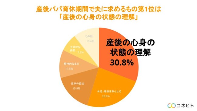 本年10月から新設される「産後パパ育休」の該当期間である「出産直後~8週間」に夫に最も求めるものを聞いたところ、第1位は「産後の心身の状態の理解」でした。「休息・睡眠をとらせる」「家事の担当」「精神的な支え」「主体的な姿勢」と続きます。