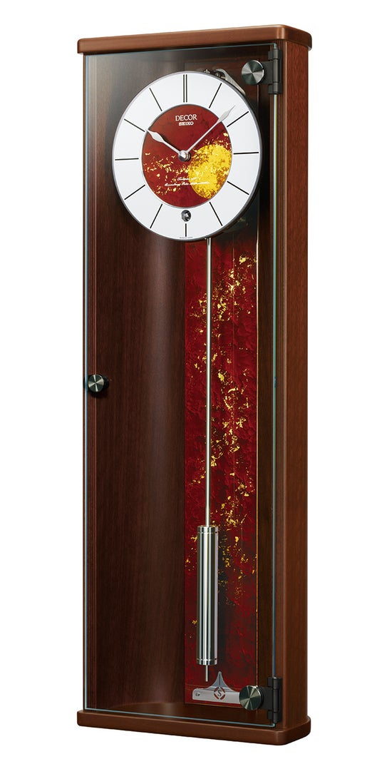 ケースは天童木工の手によるプライウッド製です。文字板に加え、振り子の後ろに見える飾り板にも「風月塗り」を施し、より華やかさを増した風合いをお楽しみいただけます